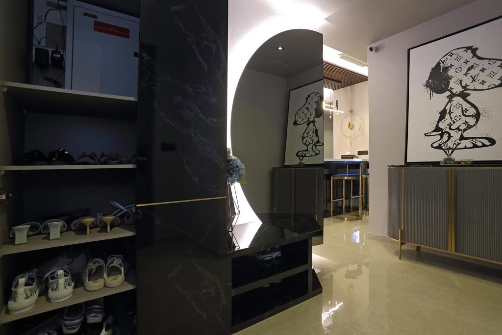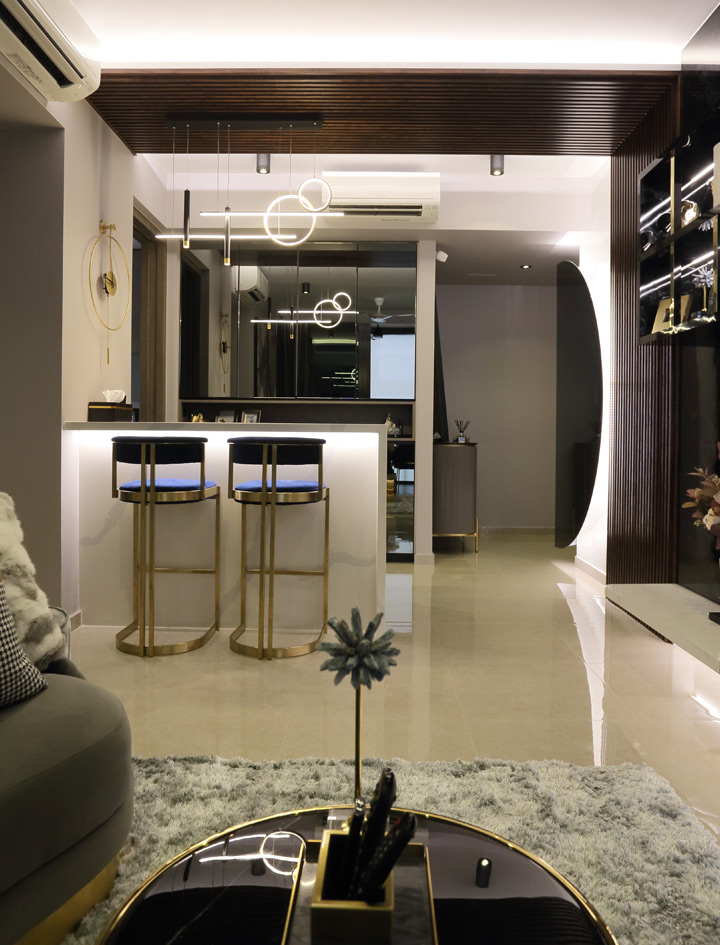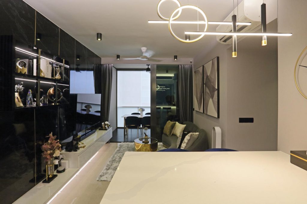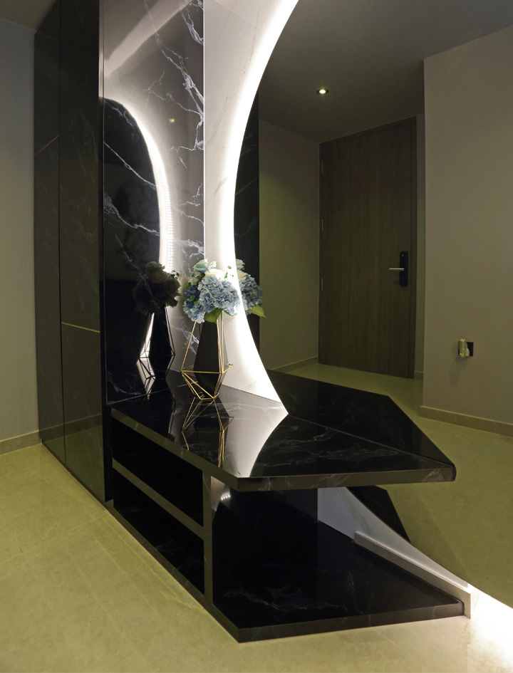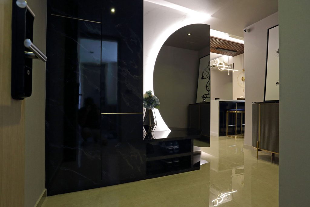 Upon entering from the main door, you’ll be greeted by a one-of-a-kind half-circled tinted mirror that wraps to the back of the living room wall with full-height shoe cabinets in dark marble laminate with gold trimming.