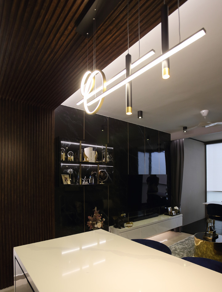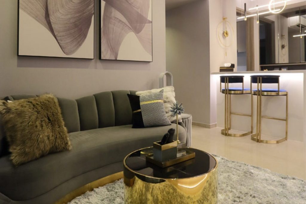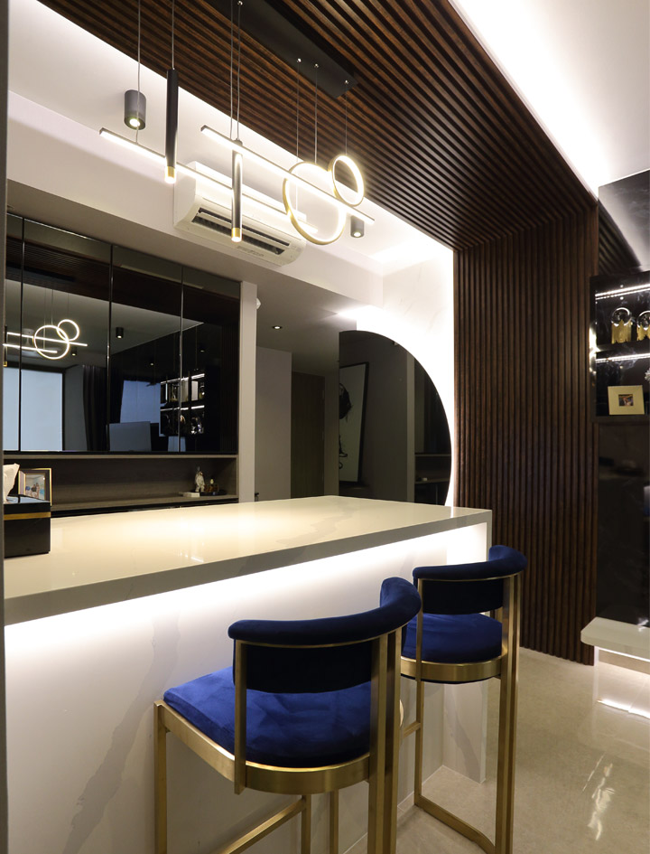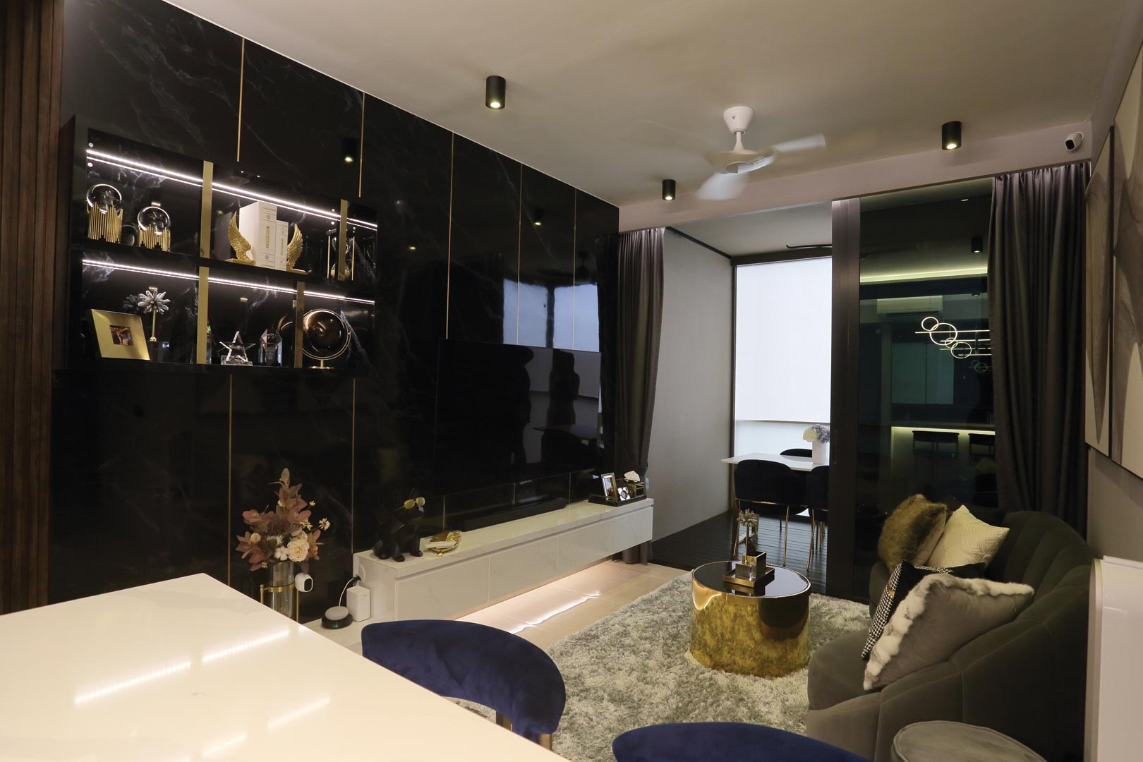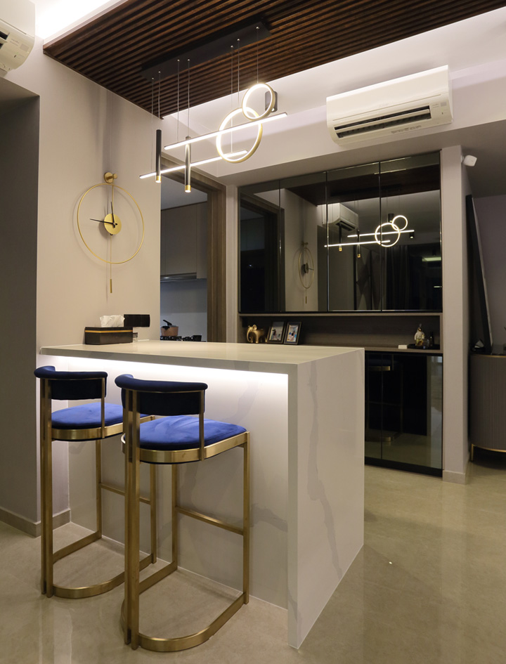 Upon entering from the main door, you’ll be greeted by a one-of-a-kind half-circled tinted mirror that wraps to the back of the living room wall with full-height shoe cabinets in dark marble laminate with gold trimming.