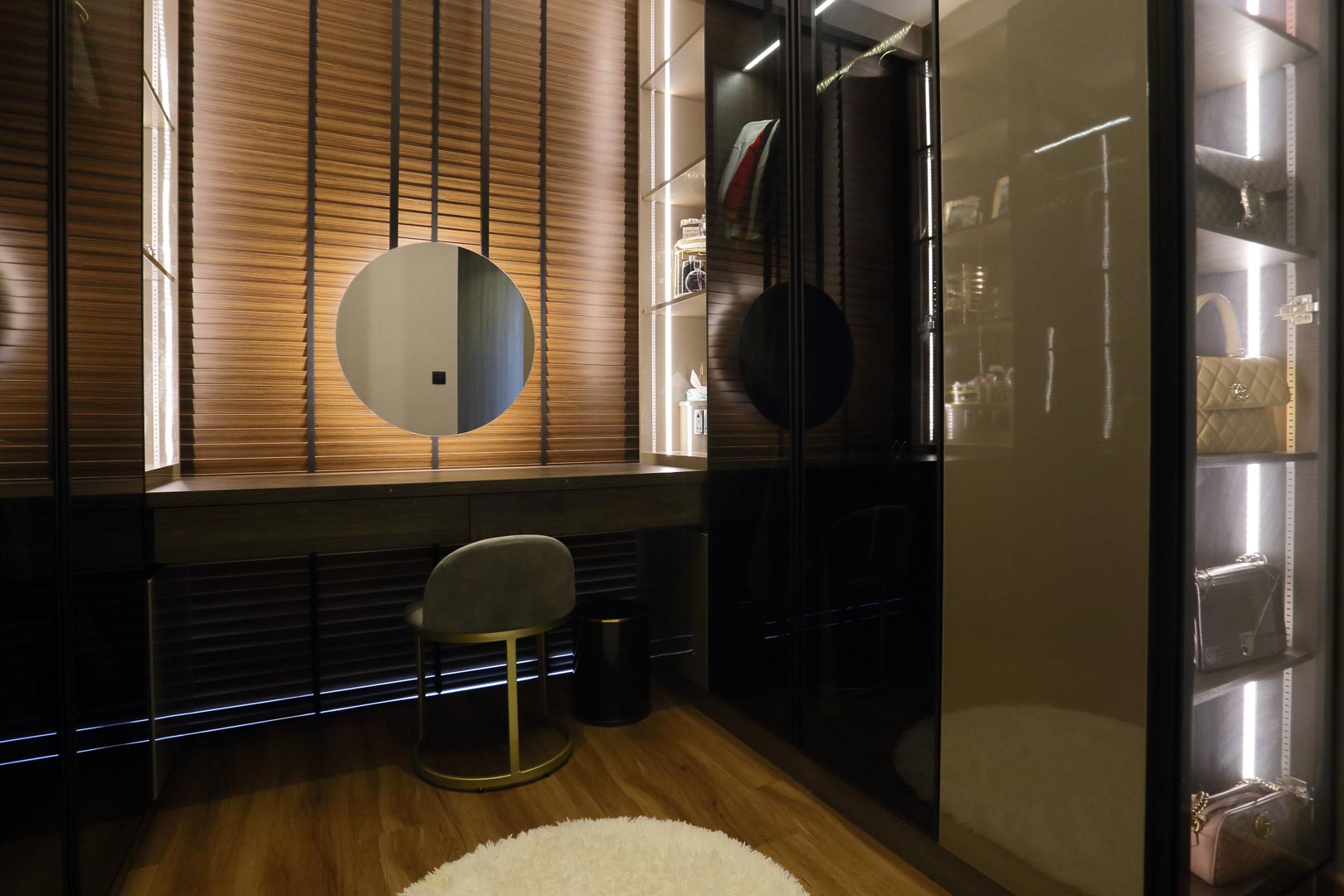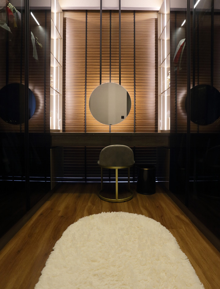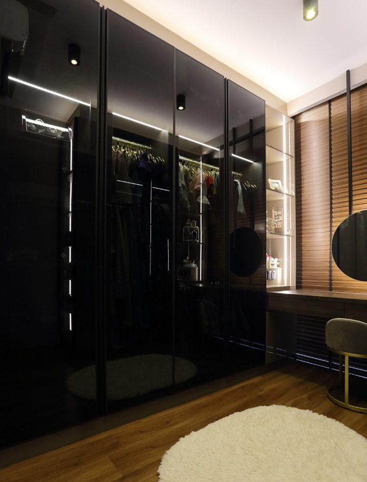 We suggest a U-shaped walk-in wardrobe layout with two rows of full-height wardrobes on either side. The design also features a customised dressing table with pull-out drawers against the wood-tone window blinds, giving the space a cosy feel. In addition, the wardrobe has dark-tinted glass doors, illuminated garment rails, and backlit shelves, creating a stylish and roomy ambience. The closet system is chic and functional, organising the homeowners’ clothing collection.