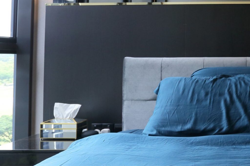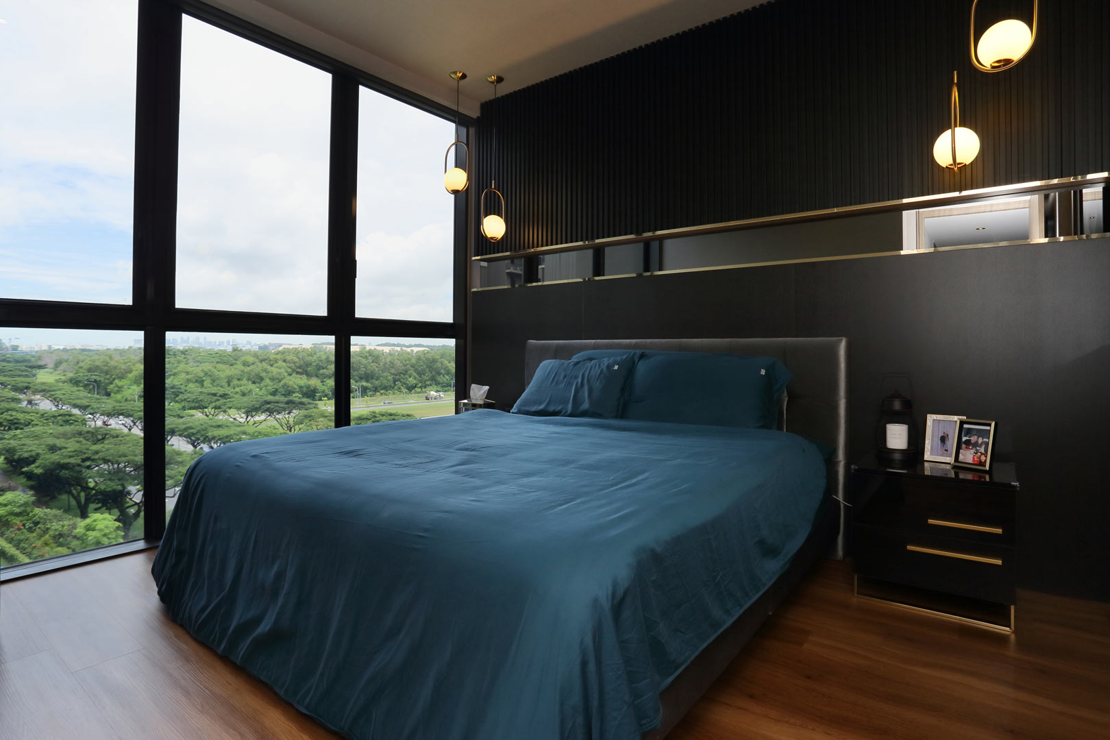 The bedroom is a true sanctuary, with a luxurious king-sized bed that is covered in sumptuous linens and pillows. One of the key design features that add a touch of luxury to the master bedroom is the headboard. We crafted a stunning headboard using dark wood-tone fluted panels with tinted mirror panels accentuated by elegant gold trim.