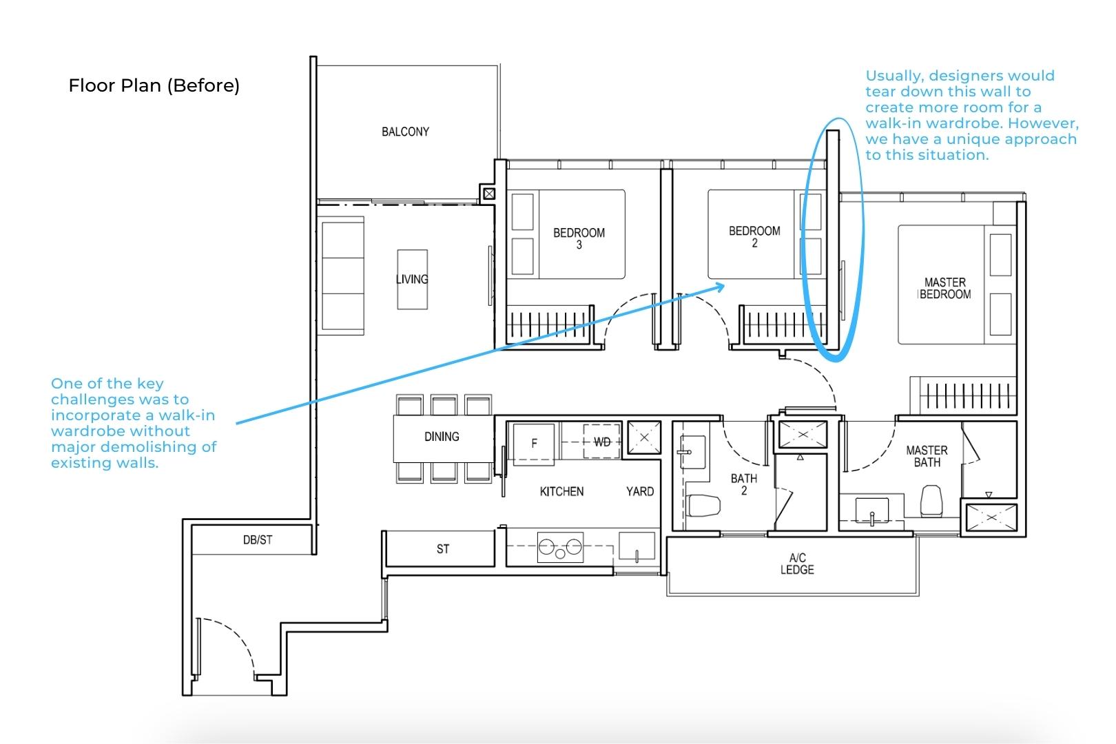 The newly unified space offers ample room for storage, organisation, and easy access to the homeowners’ clothing and accessories. This thoughtful space planning layout not only eliminated the need for costly wall demolitions but also enhanced the overall functionality and aesthetics of the master suite. The seamless transition between the bedroom and walk-in wardrobe creates a sense of luxury and sophistication while optimising available space.