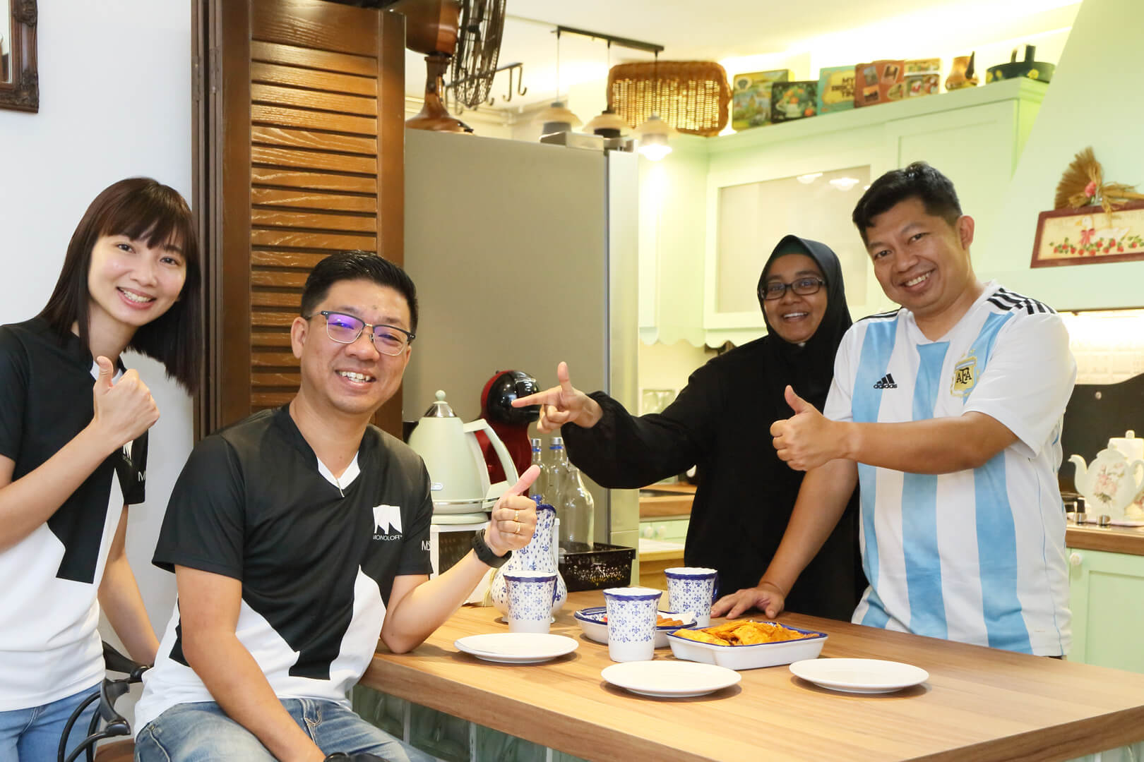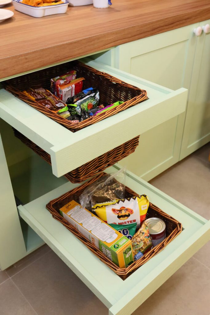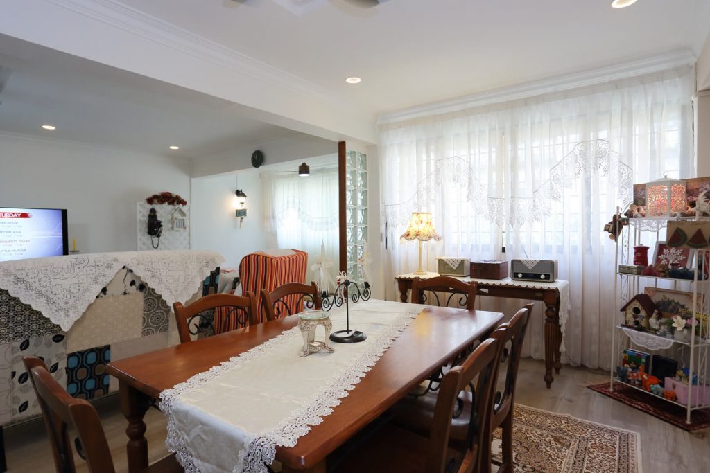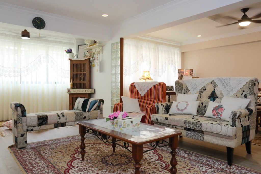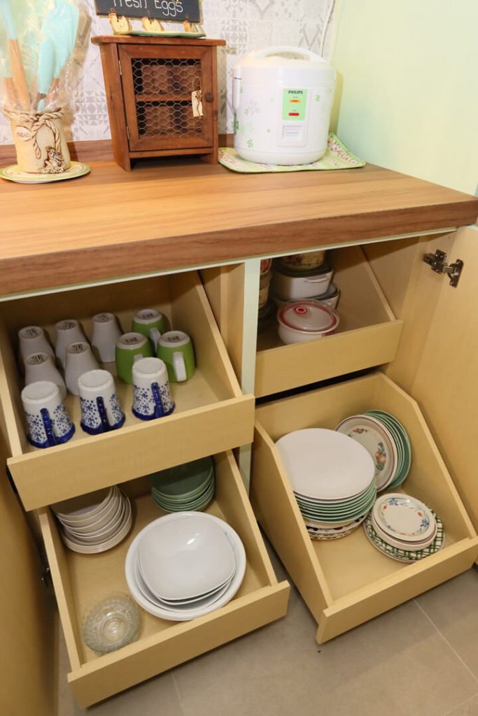 Mashita spends most of her time in the kitchen, so having an organized storage was a total renovation essential for her as well. Therefore, easy access pull-out storage for snacks, cereals, instant noodles, spices, crockery, and more was installed within the lower cabinets. The patterned floor tiles complete the whole look by adding contrast to the whole ambiance.