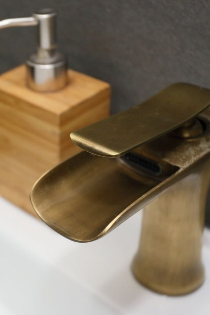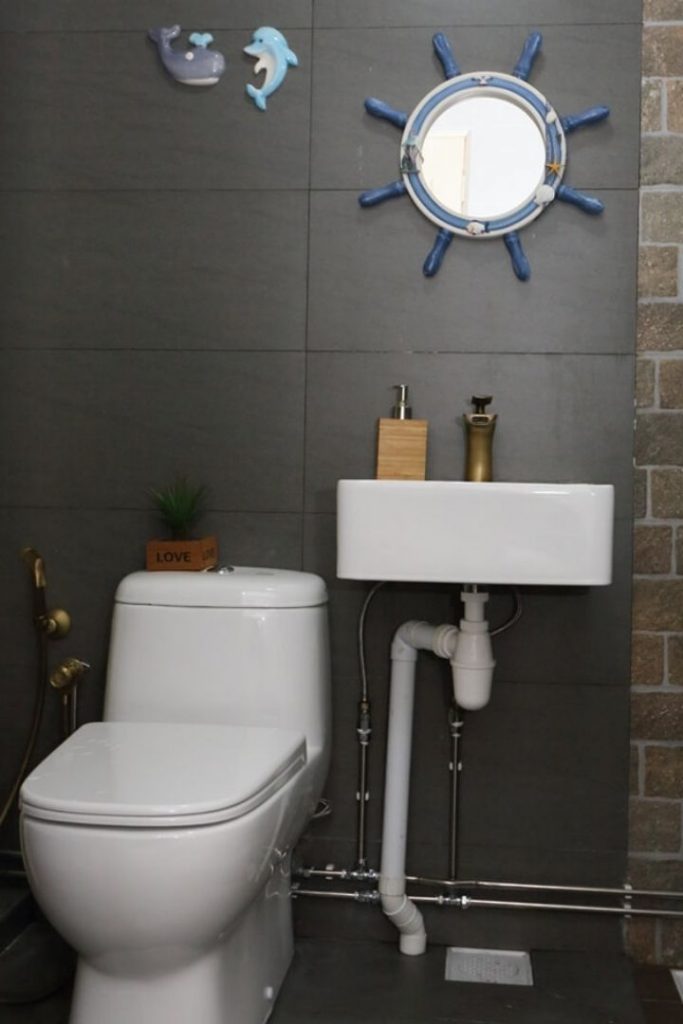 The common toilet has been dressed in a darker color scheme. It’s edgy and industrial; plain charcoal-hued tiles clad the majority of the space while the shower stall has been accented with tiles featuring an exposed brick pattern. Vintage accessories and sleek fixtures create beautiful contrast within the whole ambiance.