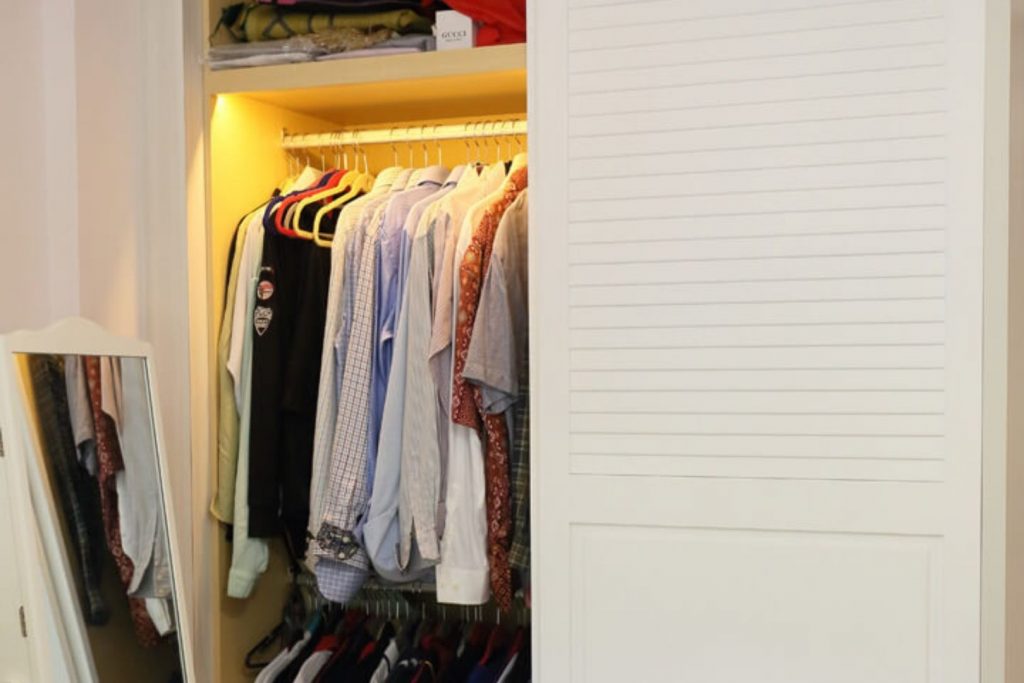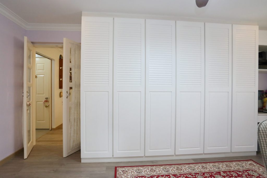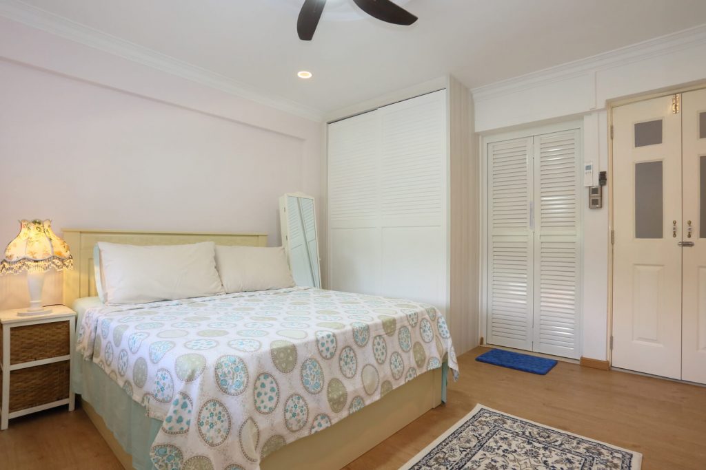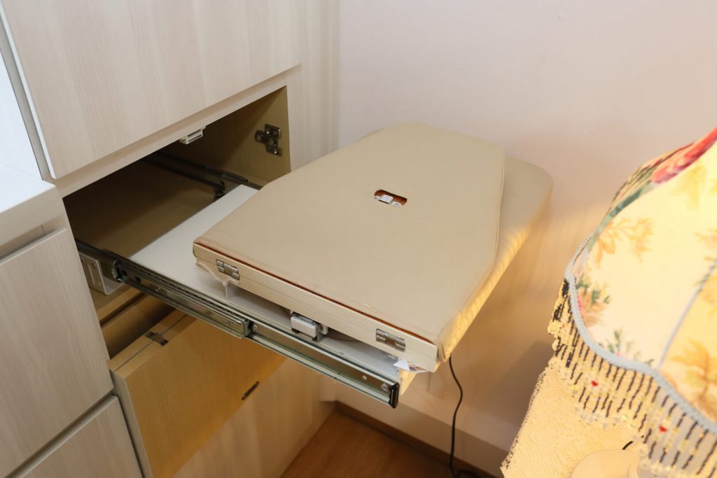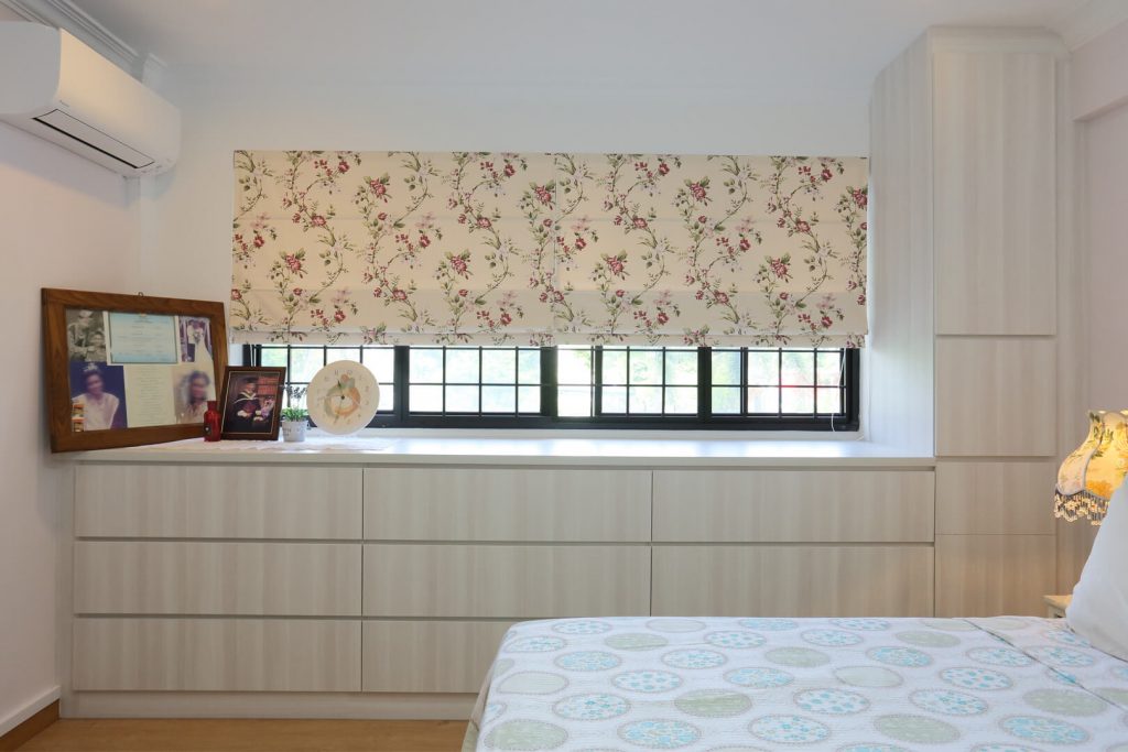The master bedroom carries through on the country chic theme featured in the rest of the home. Featuring the same color scheme as the work area, the full height built-in wardrobe with integrated LED lights brightens up the closet space and adds a hidden ‘surprise’ element to the overall aesthetic. Floral prints and classy textile patterns are another common theme in this bedroom that has been articulated through the roller blinds and oriental area rugs. There’s also a feature-length cabinet for more storage that runs to the edge of the window. A collapsible ironing board has been integrated in the cabinet as well to keep the room more organized.
