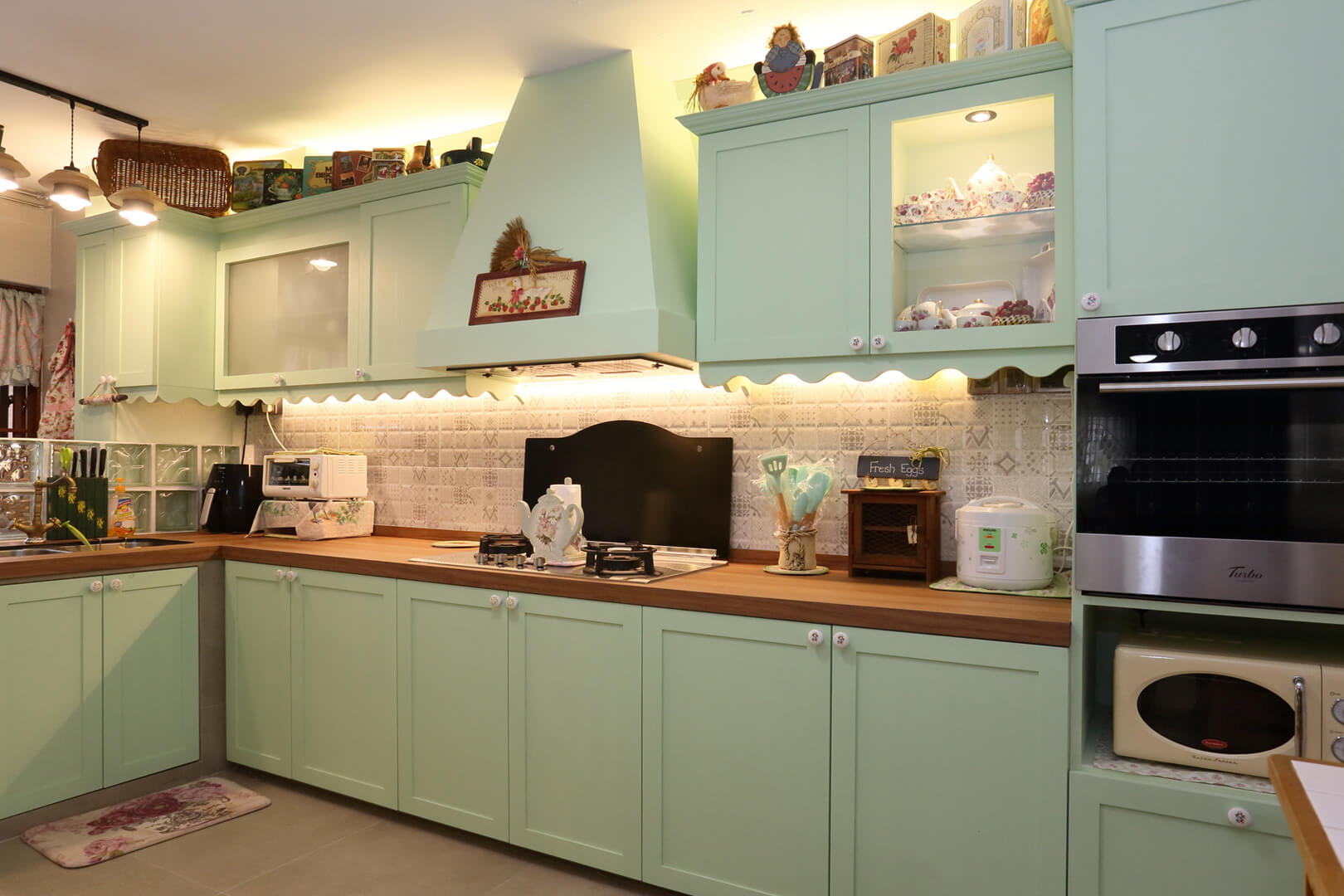 The warm aesthetic of the countertops is complemented by the mint-green cabinets and storage. Since the kitchen is mostly Mashita’s domain, she wanted a mint-green theme for a relaxing ambiance, but none of the green laminate swatches in the market matched her expectations. At last, the designer proposed painting the wood, and the results were astonishingly pleasant. Coupled with the country-chic filigree at the bottom, under and over cabinet lights, and the small space at the top where decorative accessories from Mashita’s collection are featured, this part of the kitchen ended up looking gorgeous.