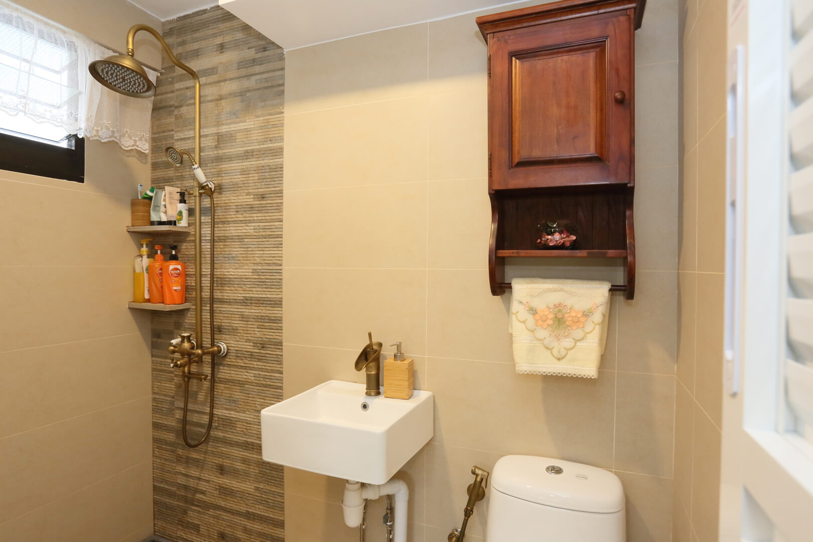 A warm vintage aesthetic has been translated in the design of the master bathroom. The shower stall has been accented with textured tiles in darker shades, while the rest of the space is clad in plain tiles in a lighter finish. A classic wooden cabinet has been installed above the commode, while sleek white fixtures complement the whole look with a modern edge.