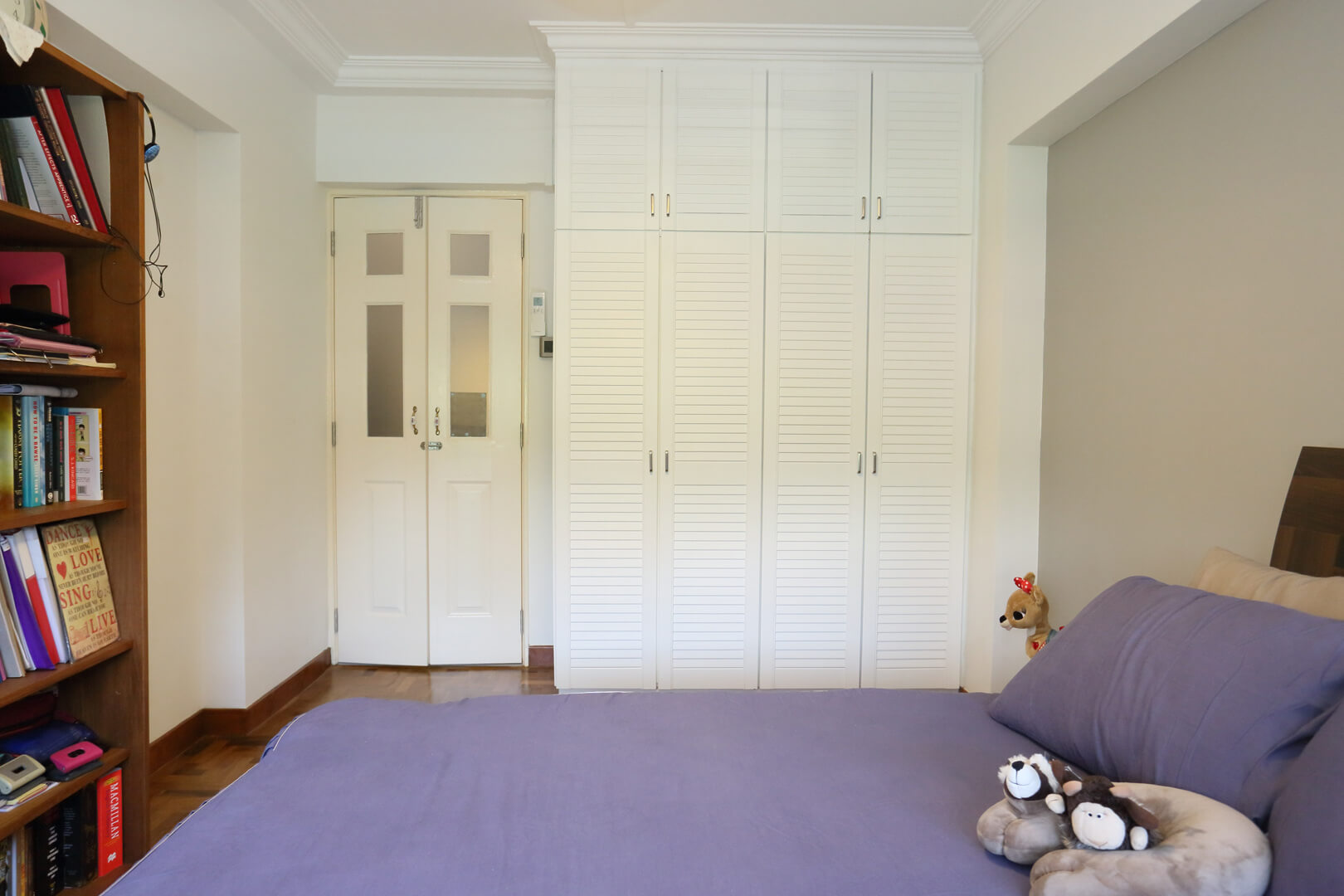 The common bedroom belongs to Kamal and Mashita’s daughter, who’s still a student. The ambiance has been kept simple so as to not impact her concentration during studies. The feature-length wardrobe with its shuttered doors adds a country chic aura to the ambiance, while the warm wooden floors, simple bookshelf, and kitschy roller blinds add an eclectic beauty to the room.