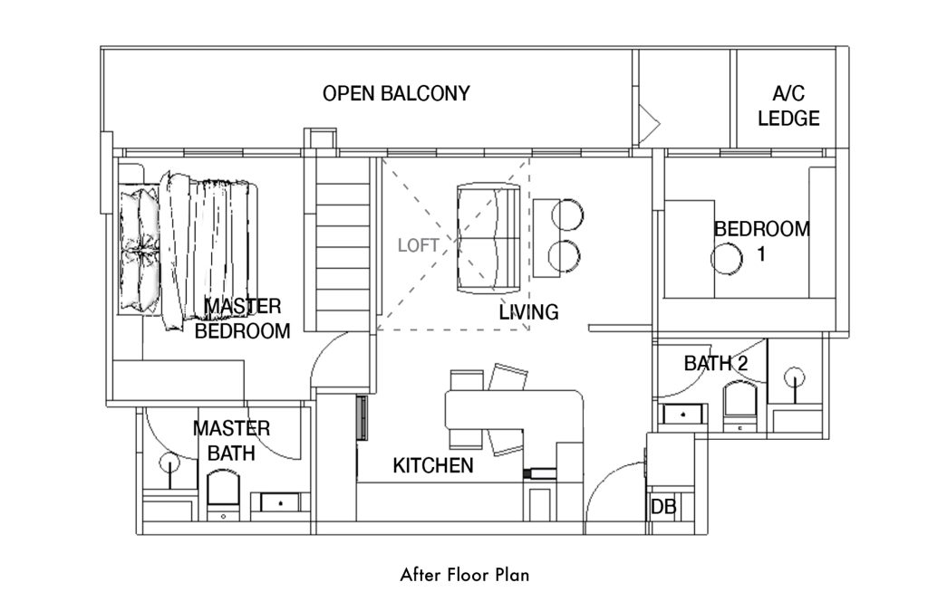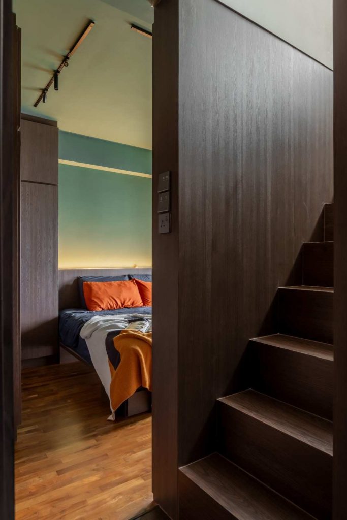 To preserve the clean, uninterrupted visual flow, we integrated a seamless concealed push door into the feature wall, leading to the master bedroom without breaking the design line. We also tucked the stairway to the loft into the structure of the TV wall itself, allowing essential functions to quietly blend into the overall aesthetic. This design move not only maximises space but also highlights how form and function can coexist beautifully in a thoughtfully planned home.