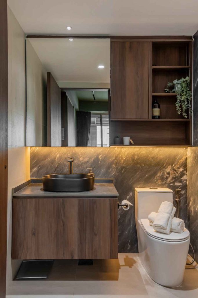Beyond the finishes, we focused on smart storage that blends seamlessly into the design. Sleek sliding mirror cabinets, thoughtfully placed open niches, and a tic-tac mechanism side cabinet offer practical storage without compromising on aesthetics. Everything has its place, yet the space feels effortlessly uncluttered.