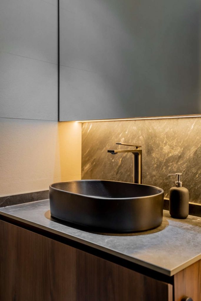 We also used a palette of cool greys, deep wood tones, and soft marbled swirls, bringing a sense of harmony and continuity, making the space feel grounded yet elevated. The textures are layered, but never overpowering, creating a perfect balance between calm and sophistication.