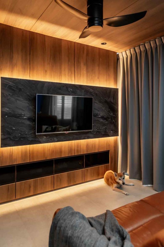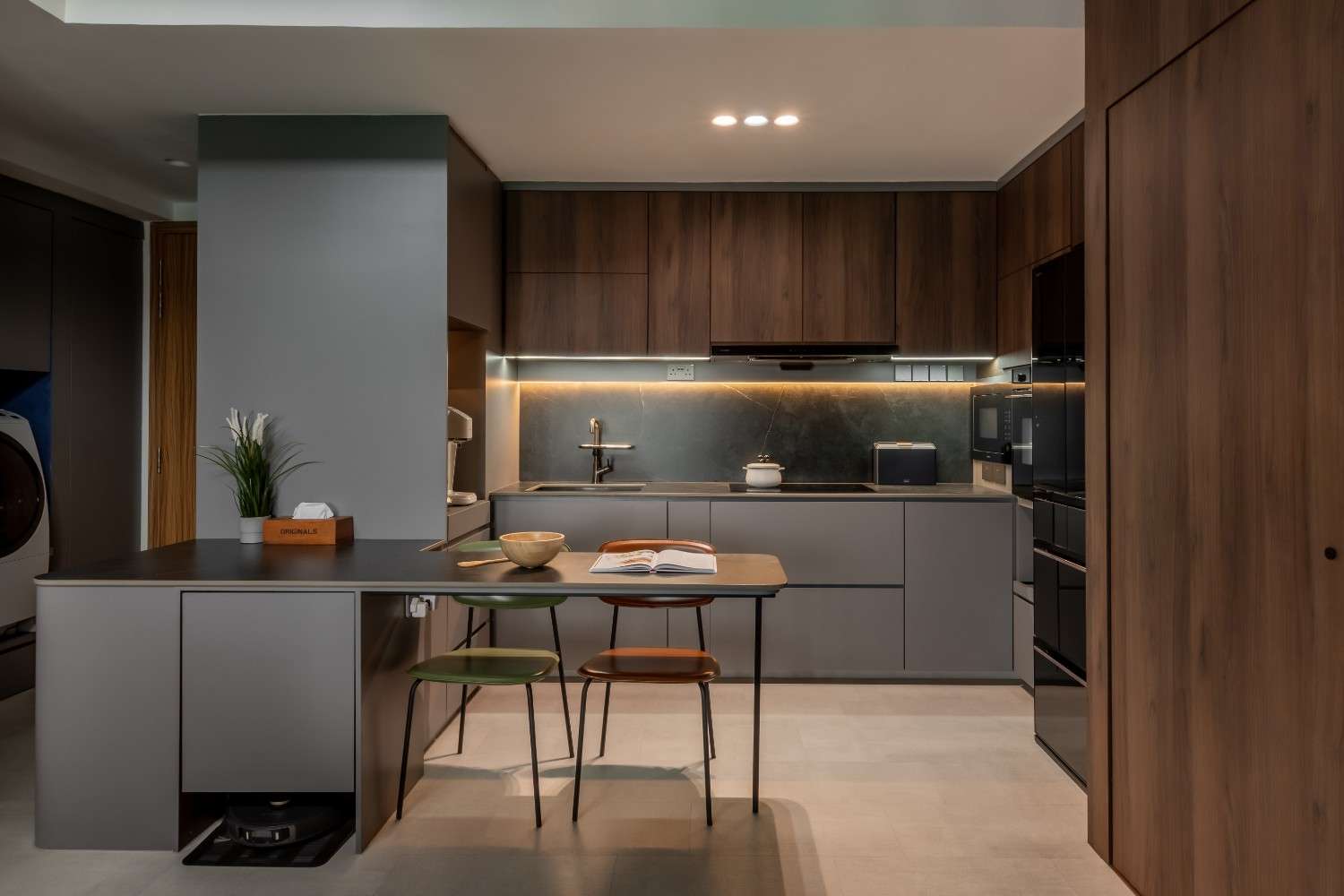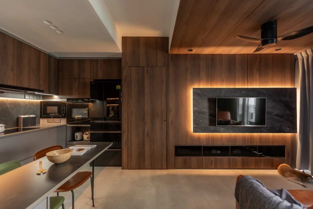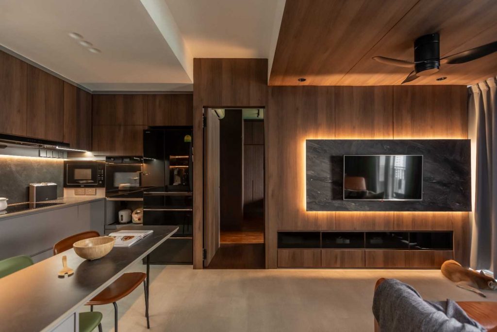 Moving from an HDB to a condominium often means downsizing in space, which can make an open-concept layout feel even smaller without proper zoning. While our clients loved the openness, they also wanted clear definition between the kitchen, dining, TV entertainment, and entryway without making the space feel closed off.