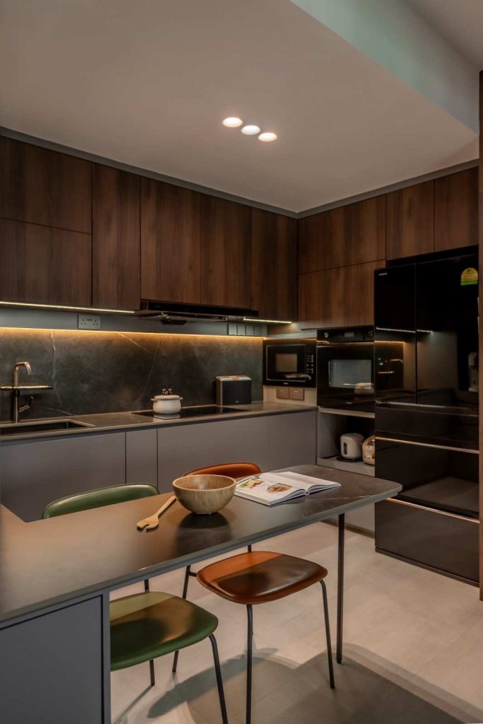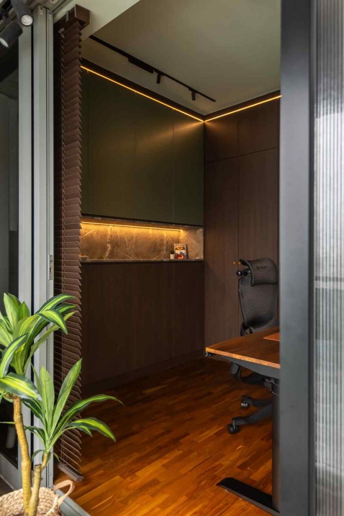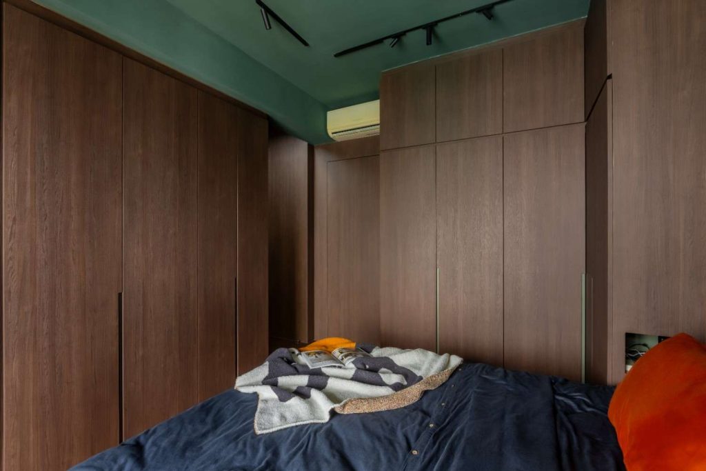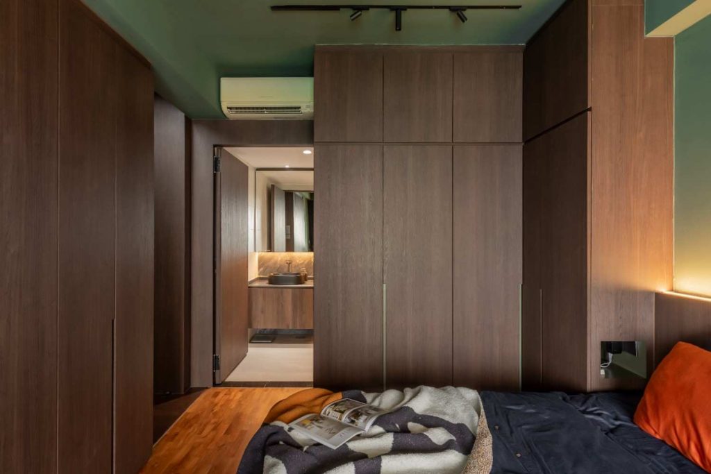 But this bedroom isn’t just about function—it’s also deeply personal. Inspired by the homeowner’s love for olive green and calming forest tones, we curated a palette of dark wood laminates paired with green accents to create a space that feels grounded and serene. One of the most striking features is the custom headboard, softly lit with integrated LED lighting that casts a warm, ambient glow against the olive-toned wall—adding depth, mood, and a sense of quiet luxury to the room.