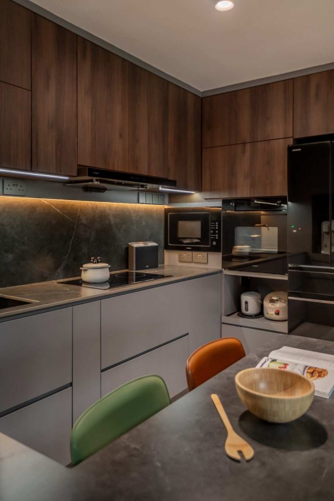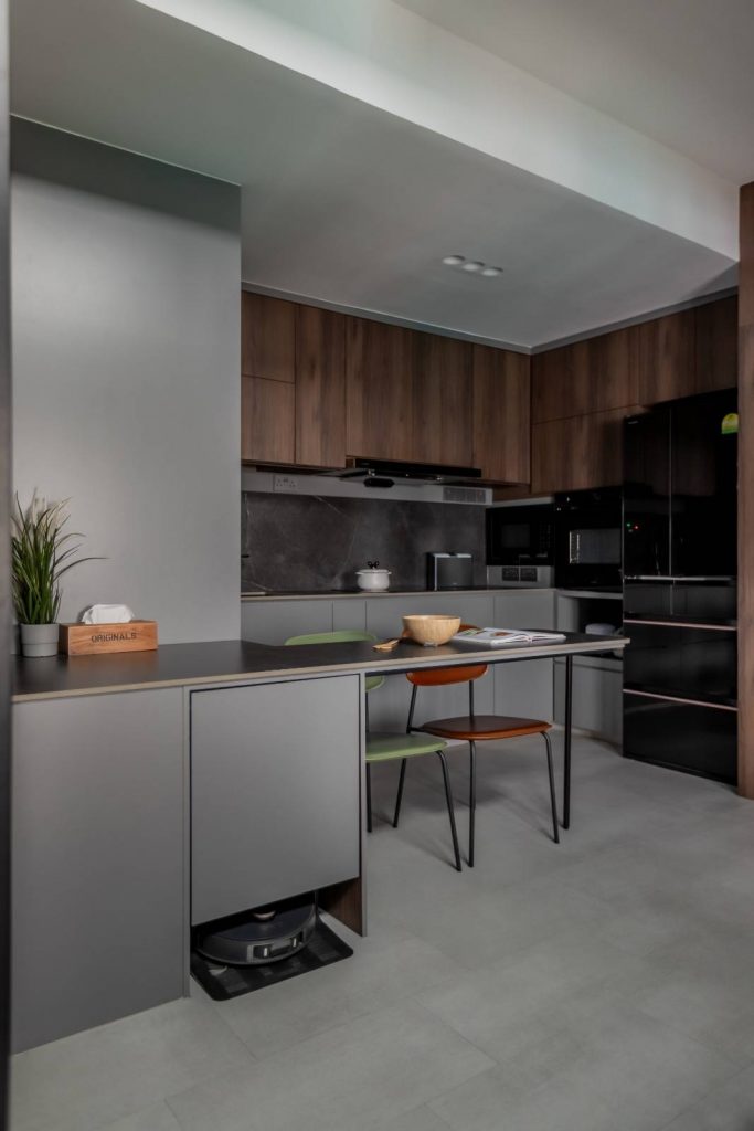 To maintain a seamless aesthetic, we designed a concealed door using the same grey laminate as the surrounding cabinetry, discreetly integrating the common bathroom opposite the entryway. This keeps the design cohesive while ensuring practicality.