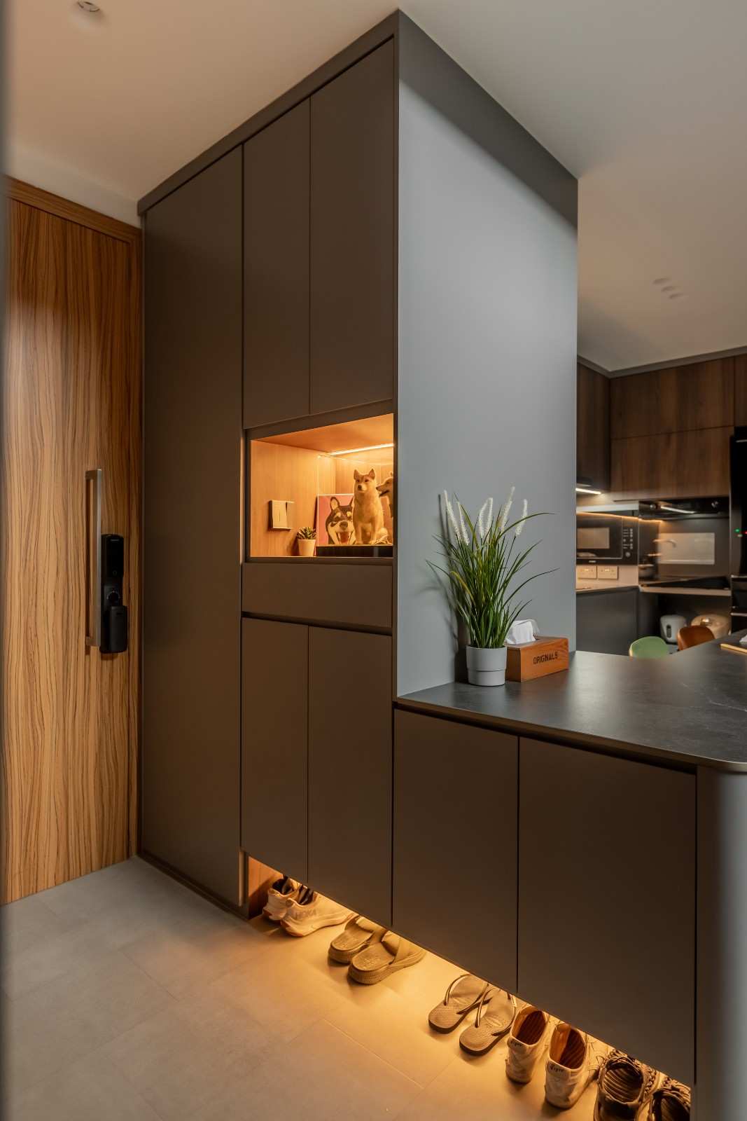 Here’s how we transformed their home – instead of stepping straight into the living area, we designed a welcoming entryway with full-height cabinets for ample storage. An open niche with built-in LED lights keeps frequently worn shoes accessible while neatly storing the rest.