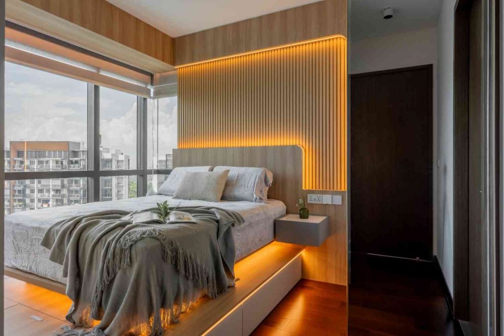 The master bedroom’s design is all about maximised space and thoughtful details. We customised a storage platform to keep things functional without sacrificing style. Curved edges and soft LED lighting bring a gentle, restful glow to the room.