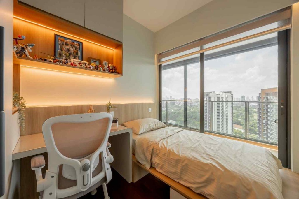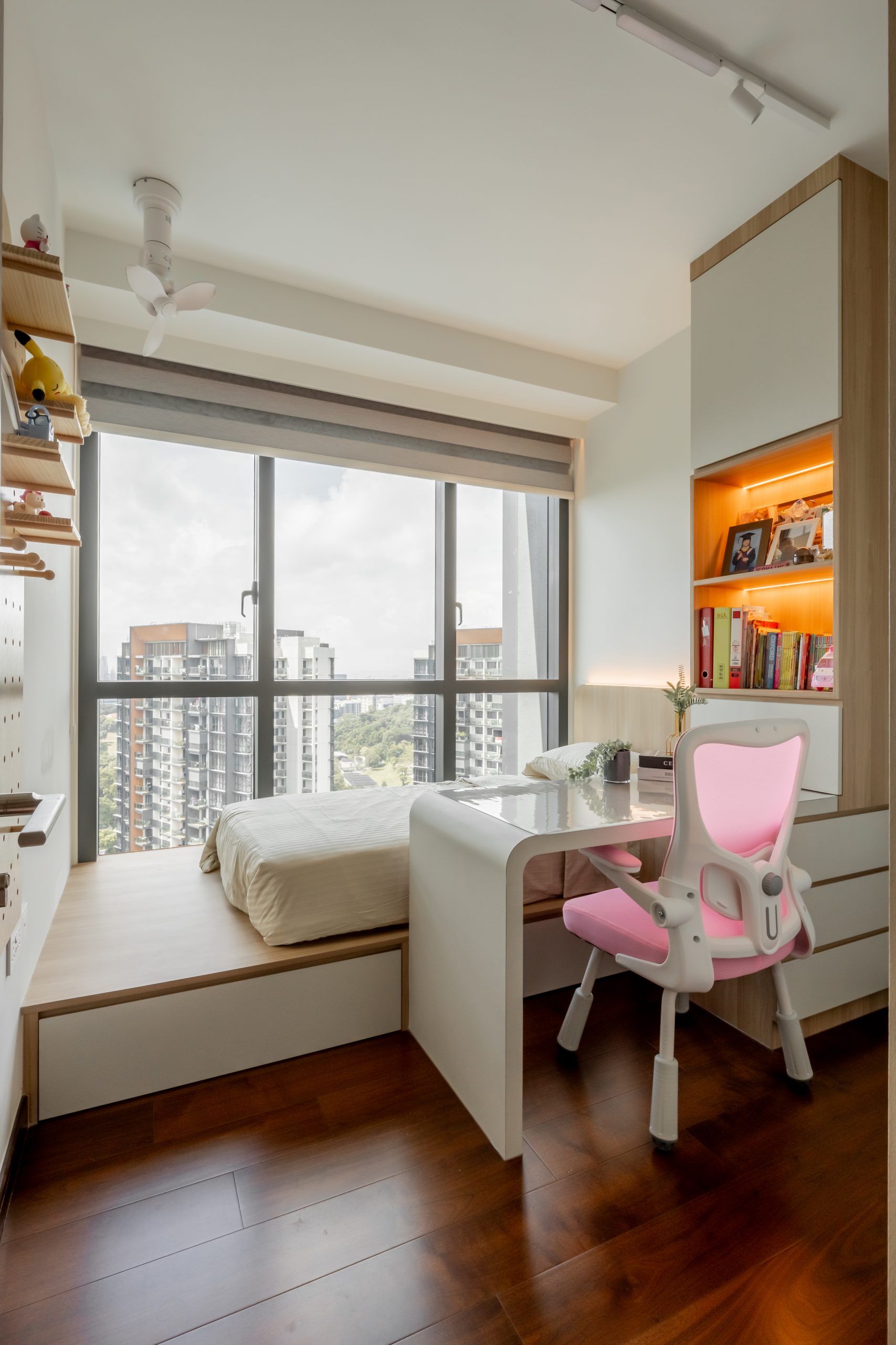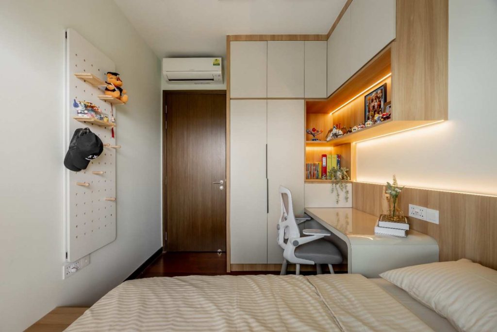 And for the daughter’s room, we gave it a pastel accent wall and a desk that’s flush to the bed with drawers and the wardrobe for all her things. The custom platform bed with storage keeps everything organised, making the room spacious and practical.