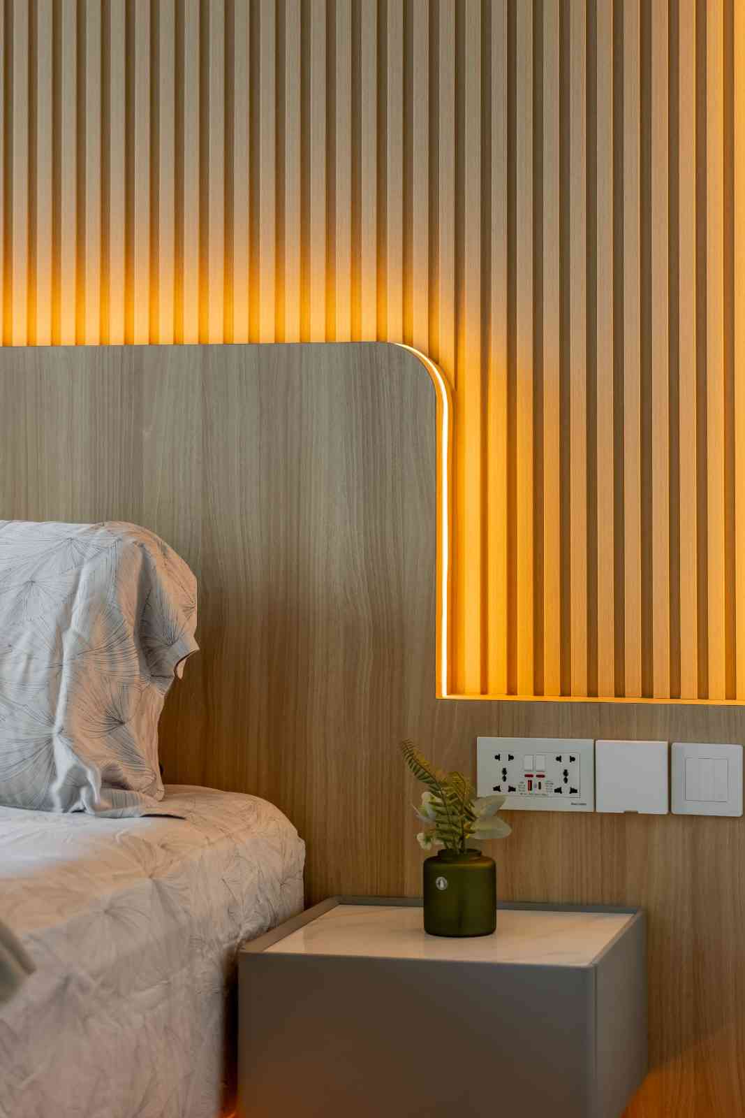 We took the headboard all the way up to the ceiling with fluted panelling to visually elongate the space, adding both height and beautiful texture. For the bed, we crafted a thinner-than-standard base to create an open, spacious feel in the room. And because the homeowners are quite tall, we raised the platform slightly, perfect for their needs without compromising style.