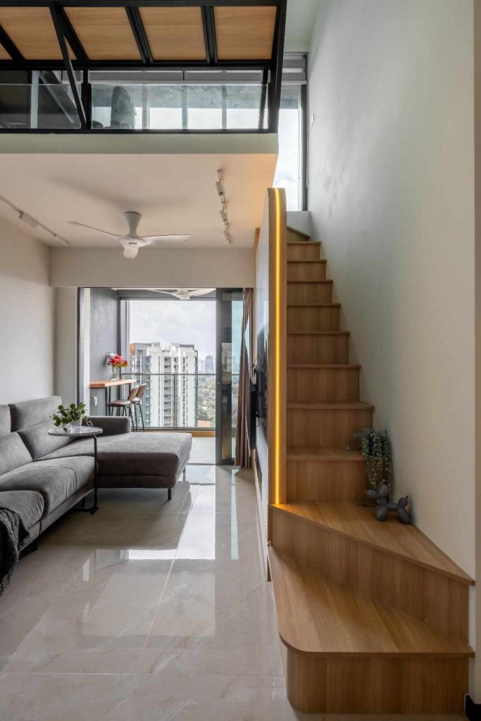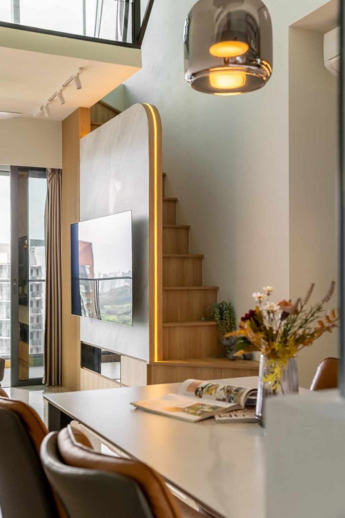 One of the biggest changes to the space was the addition of the loft above the living room, meant to make the most of the 4.8-metre ceiling. It functions like a little home office and gaming area up there. There’s also a cantilever for extra storage without going over the floor limit regulations. That really helps keep the loft feeling open and spacious. To get to it, you take a little flight of stairs behind the TV wall. It’s made of pine wood and has these cool sensor LED lights for ambience and to keep you safe.
