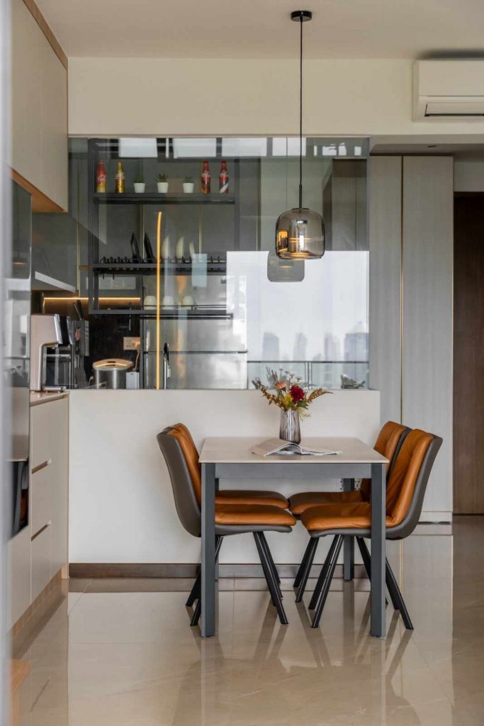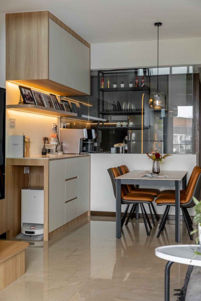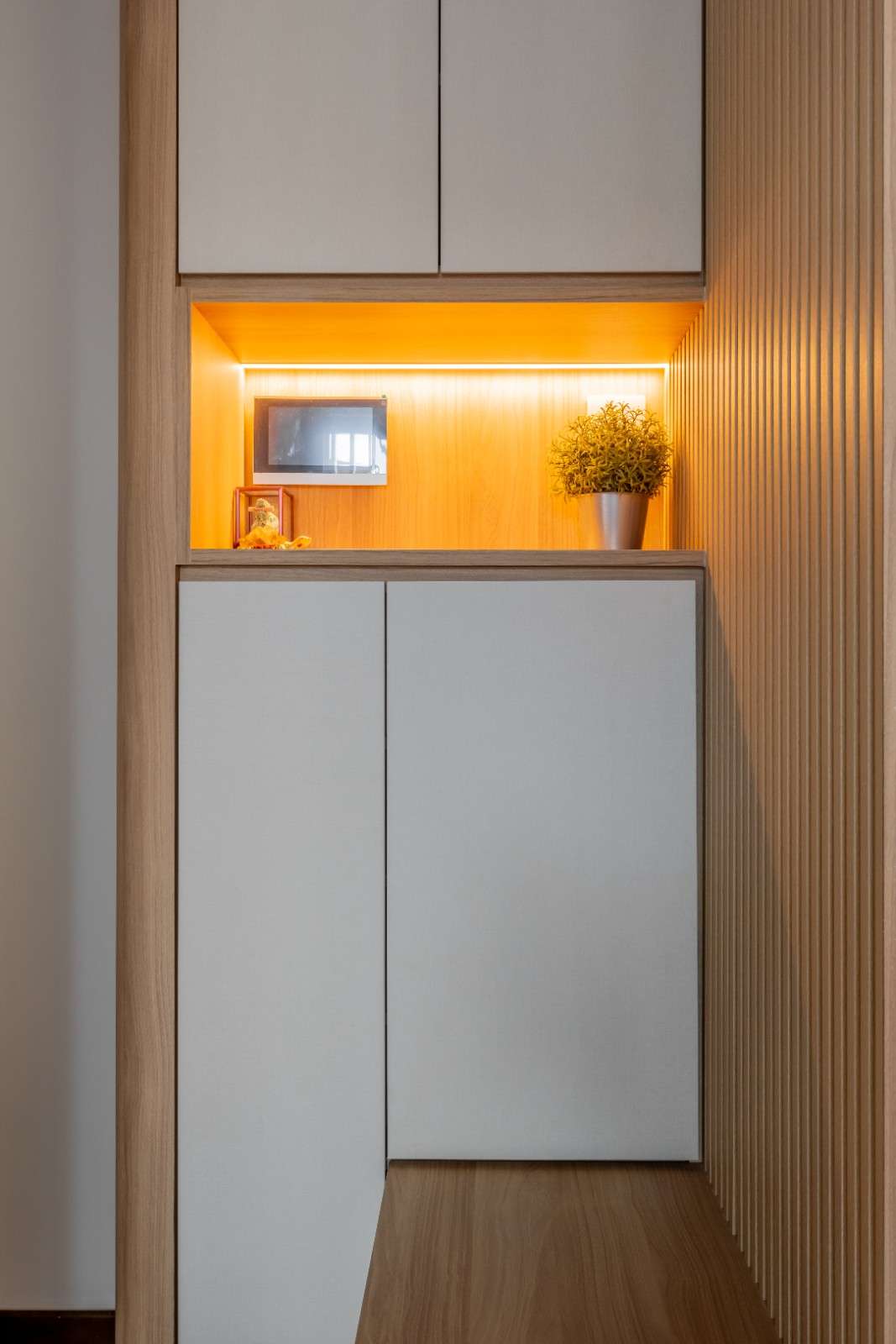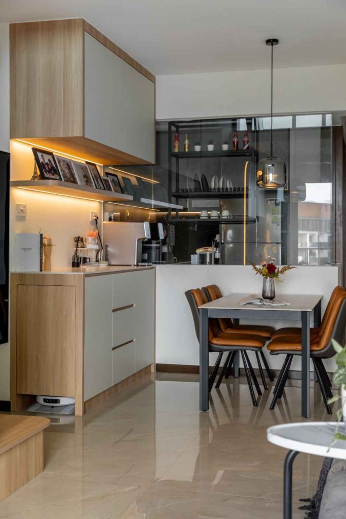 The TV wall feature wall is also a focal point in this 3-bedroom condominium at Normanton Park. It features a white marble-grain backdrop with a concealed LED strip, various storage compartments and a curved corner to soften the edges.