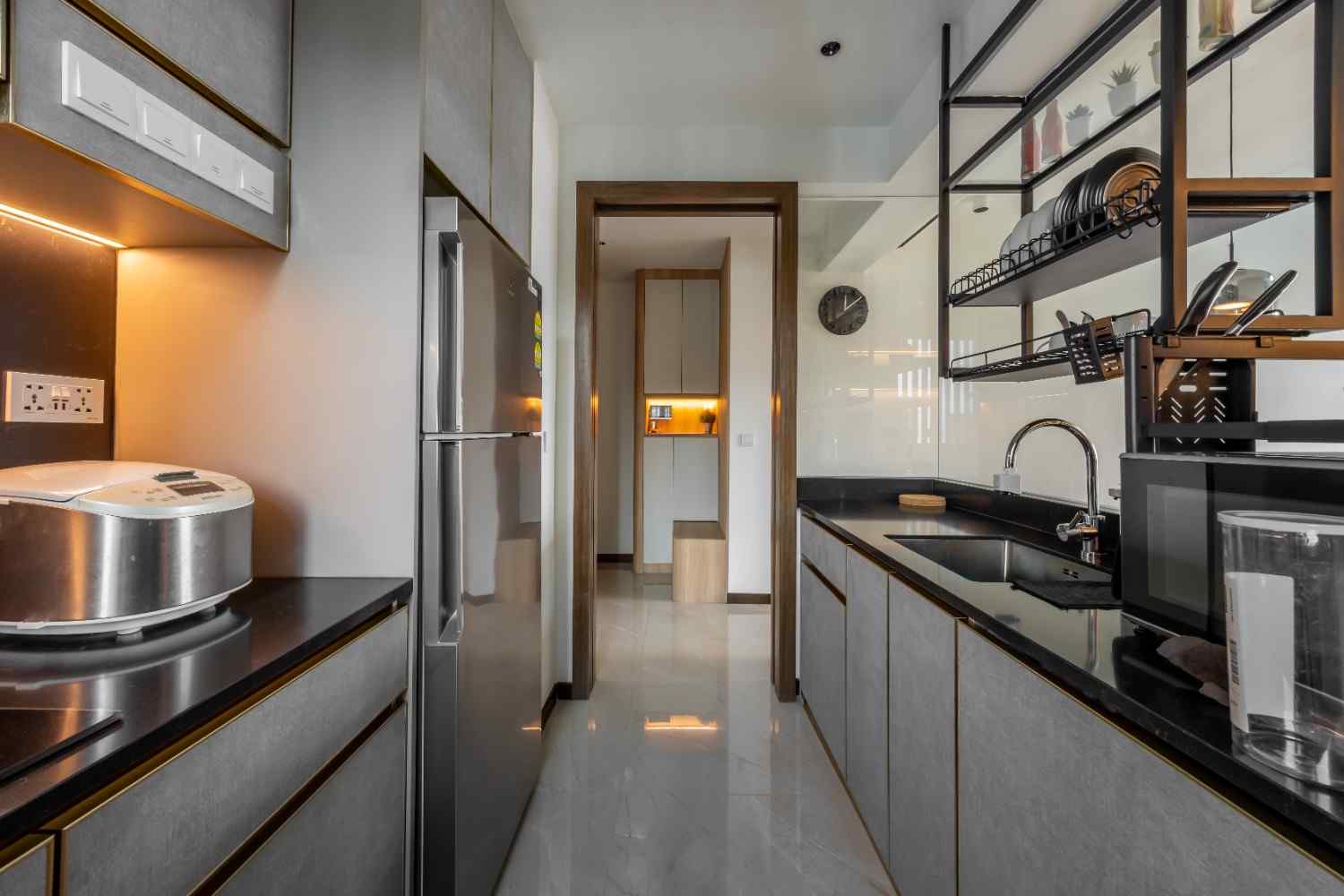 Most of the kitchen design remains as is to maintain the developer’s warranty. But we switched things up a bit by overlaying the existing metallic laminate cabinets with matte grey vinyl sticker to tone down the flashy look. It matches perfectly with the existing dark marble countertops and backsplash. Additionally, the laminate we selected is anti-fingerprint, making it practical.