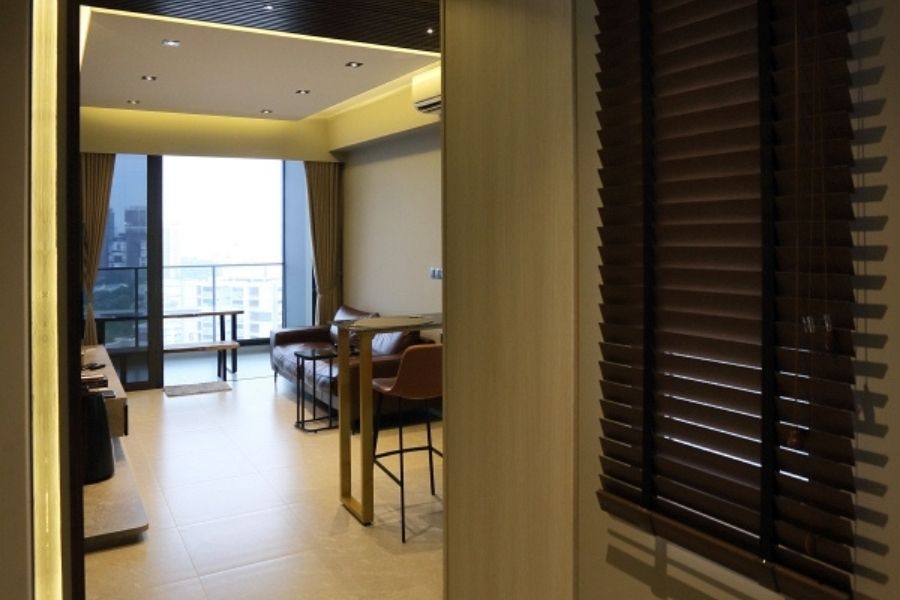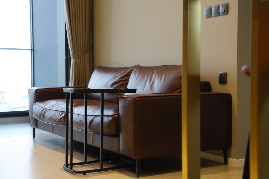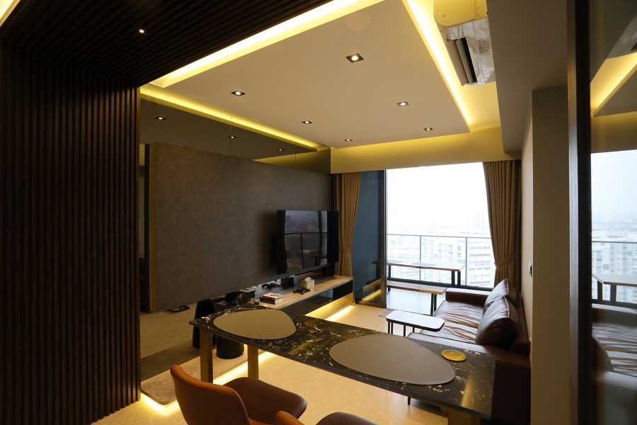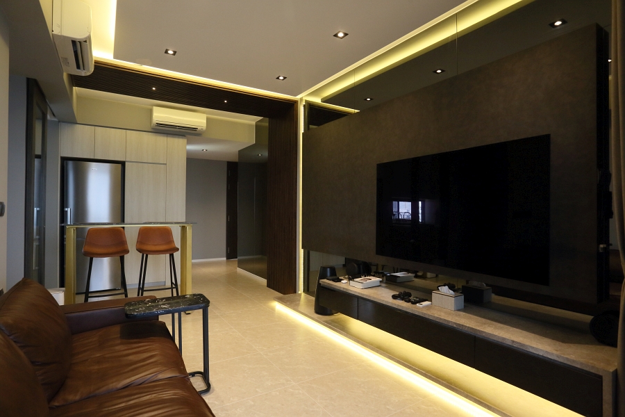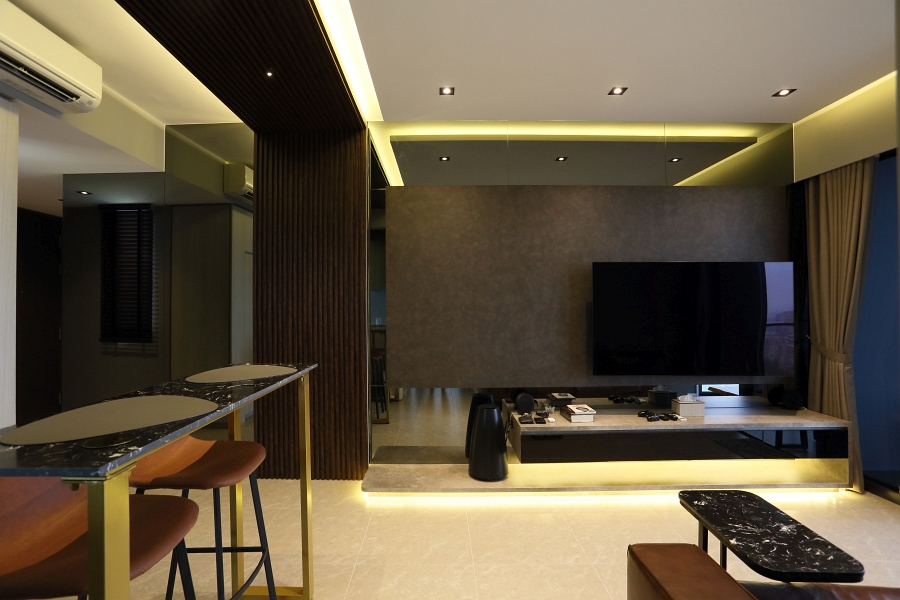 The ceiling is concealed with LED lights, somehow inspiring a future-forward space amidst the traditional materials. One couldn’t miss out the glassy door of the balcony which immediately gives a peek of the vibrant city outside. At daytime, natural light floods into the room, giving it a sleek and timeless appeal. At night, the LED lights beam from the lines and create a classic warm tone inside the undeniably masculine space.