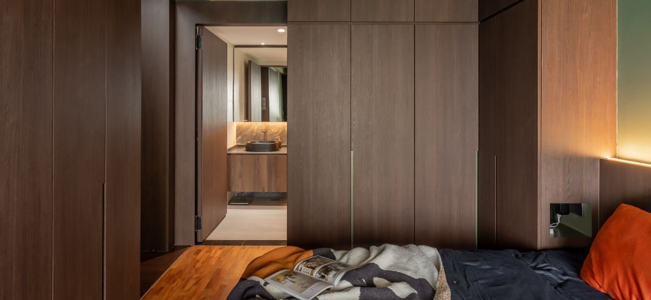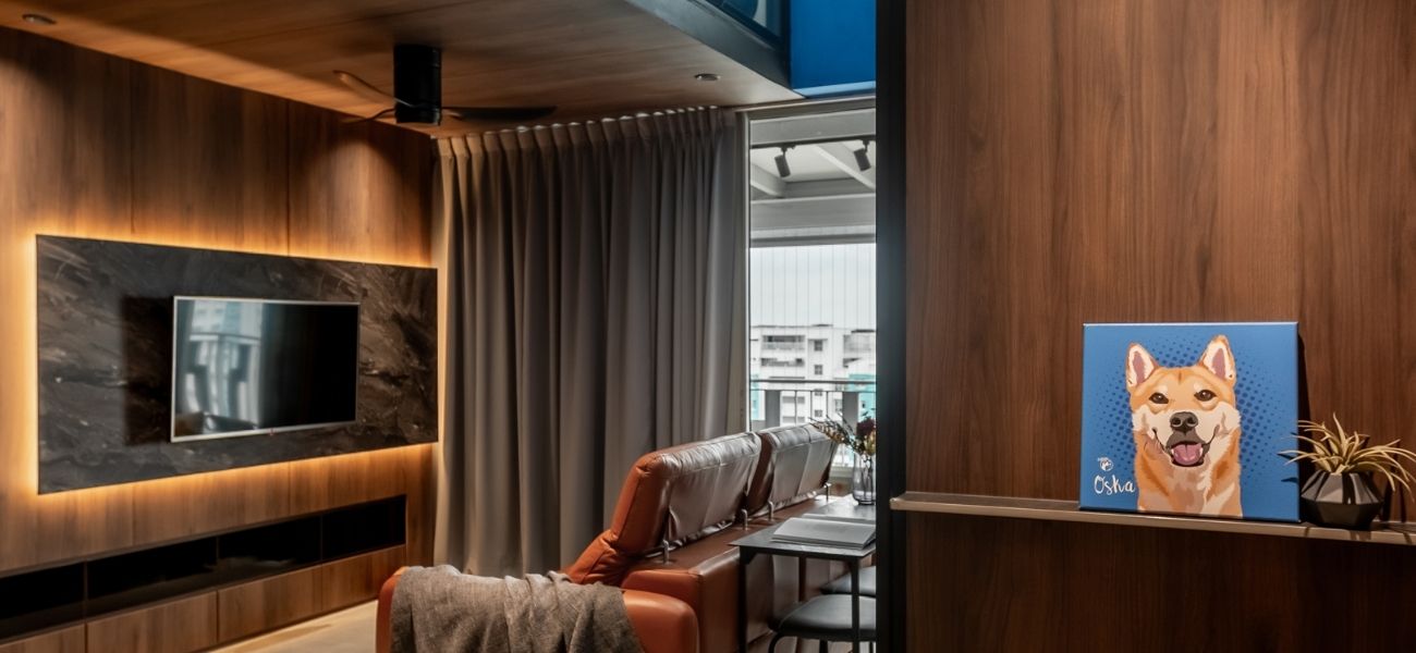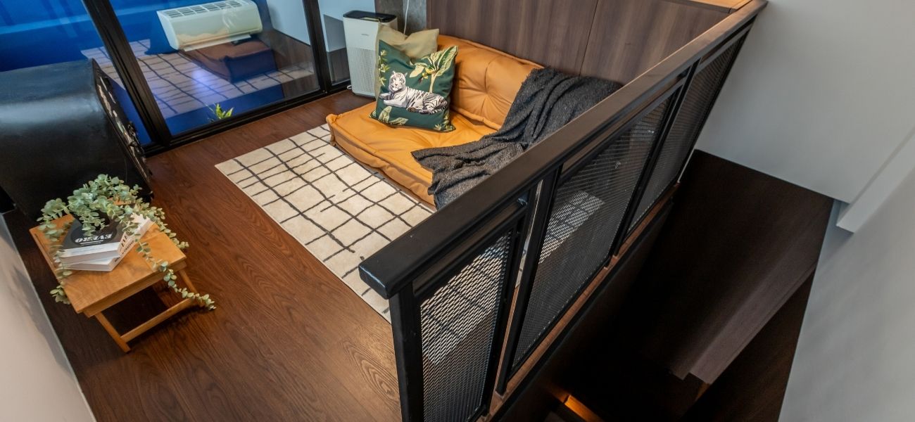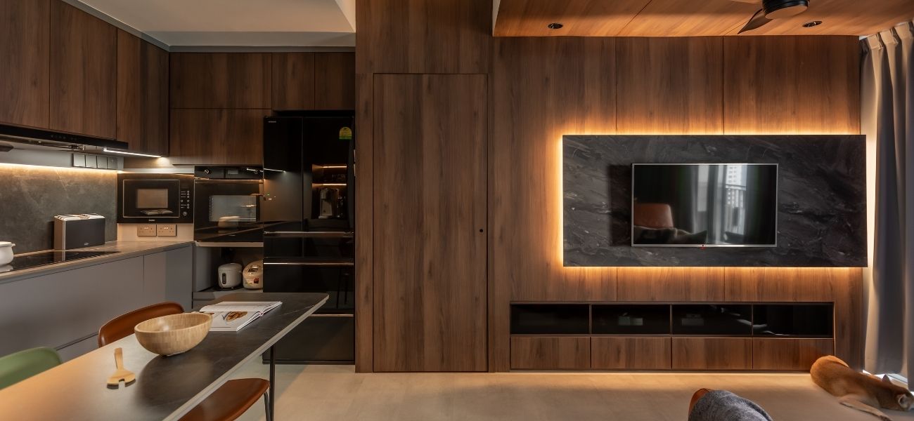 This modern loft interior design concept in Singapore brings together warm wood tones, olive green accents, and grey marbling to create a calming yet luxurious atmosphere throughout the home. From the seamless storage solutions to the hidden staircase concealed within the TV feature wall, every inch of this condo was planned with purpose.