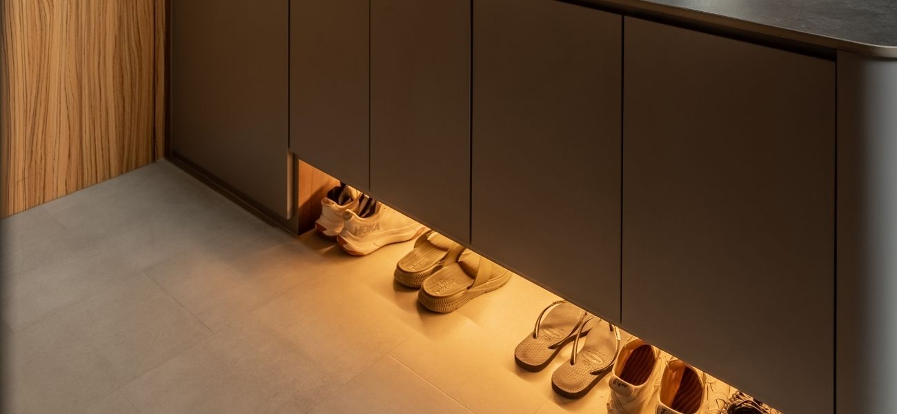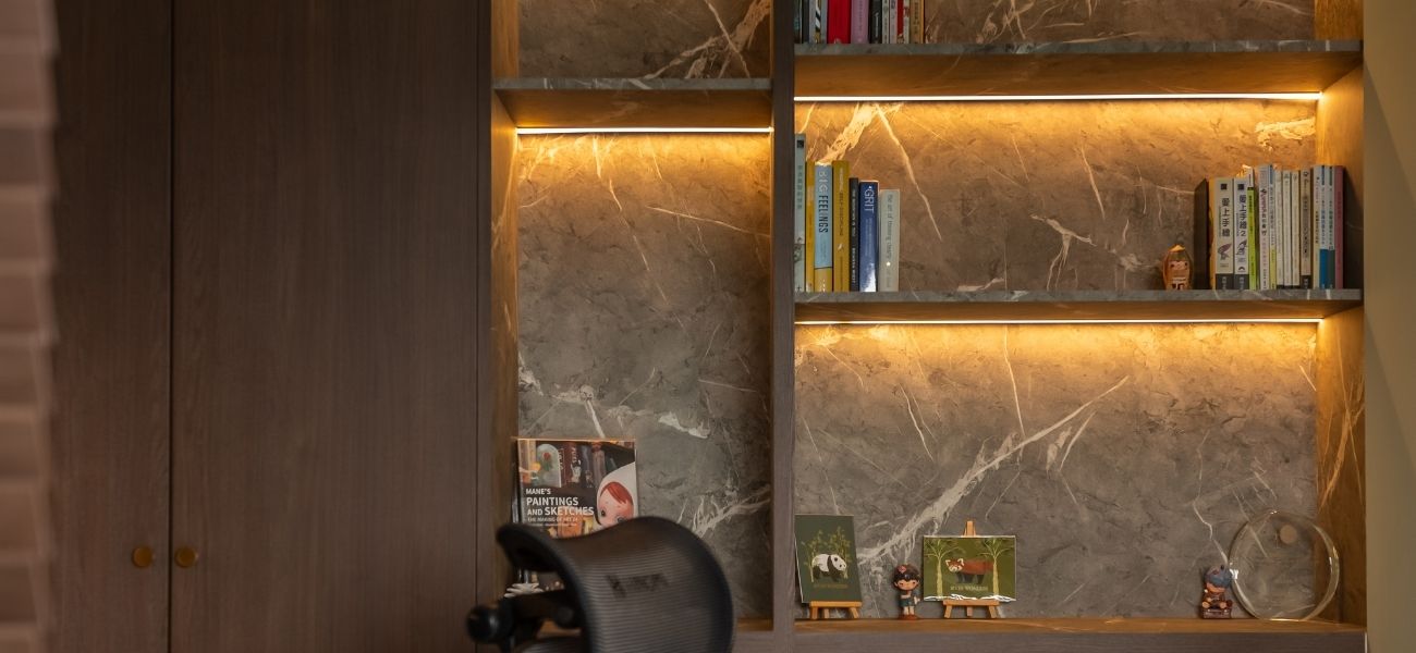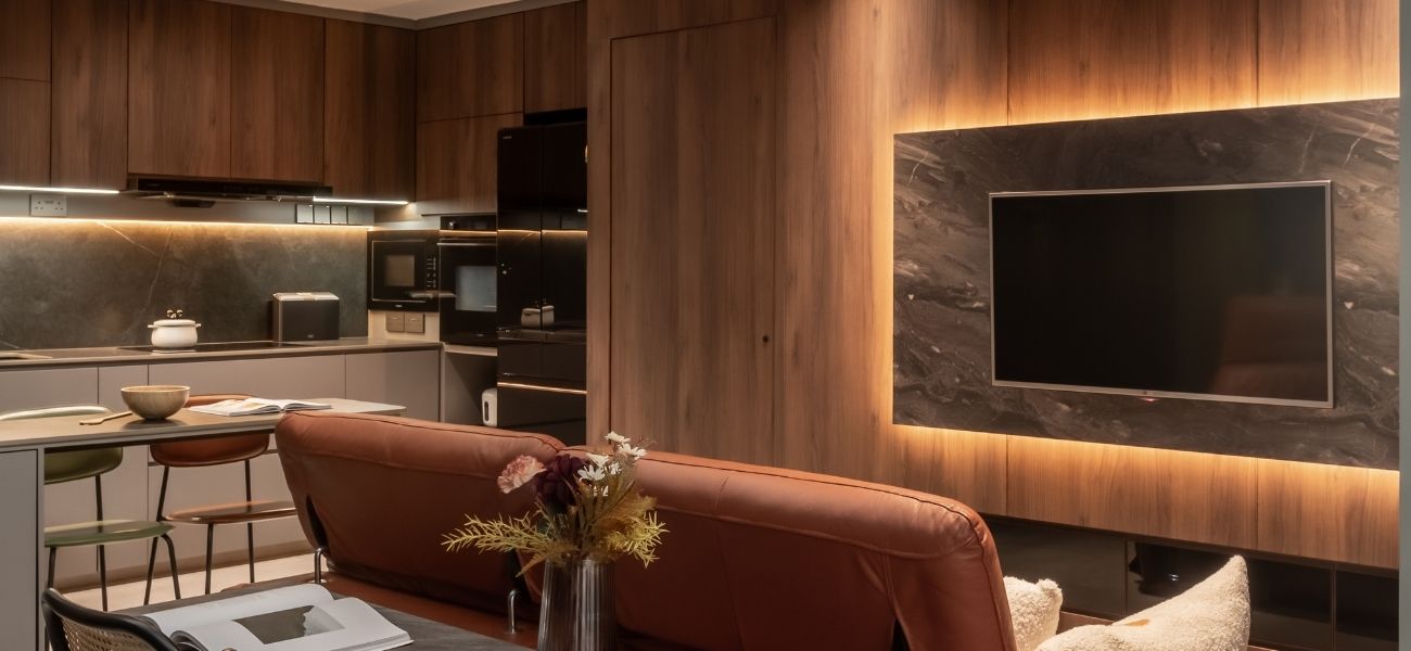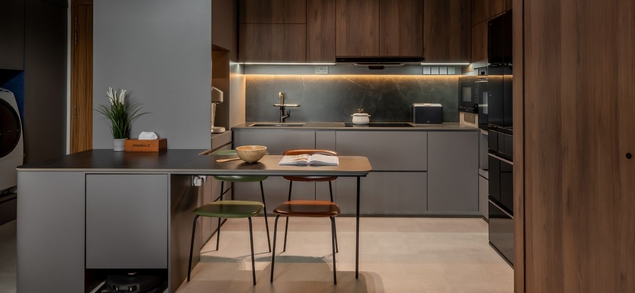 This modern loft interior design concept in Singapore brings together warm wood tones, olive green accents, and grey marbling to create a calming yet luxurious atmosphere throughout the home. From the seamless storage solutions to the hidden staircase concealed within the TV feature wall, every inch of this condo was planned with purpose.