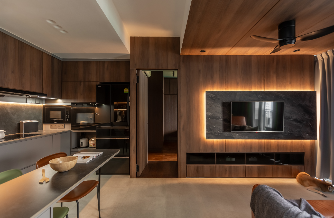 Think pale concrete laminates paired with warm timber cabinetry. This is a favourite direction for Scandinavian interior design HDB spaces seeking a subtle industrial flair.